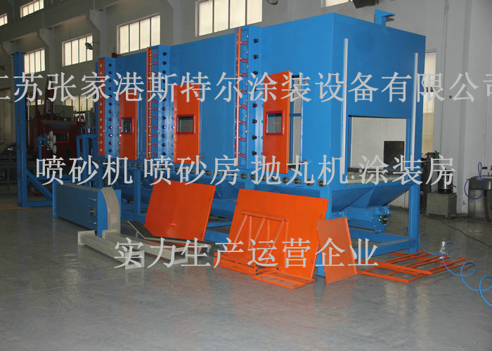 方形坩堝產品內壁處理要求而專門設計的專用型輸送式自動噴砂機,適合需求公司所提供的產品。根據需求公司對產品效率的要求,本機設置一套自動輸送線,共分五段線體。噴砂艙內共設三個噴砂位,工件通過輸送線體帶動步進方式分別在三個噴砂位進行噴砂加工清理,噴砂區域內共布置20支普壓高速噴砂咀,在噴砂區第一個噴砂位布置8支噴咀噴工件內底面,在噴砂區第二個噴砂位布置6支噴咀噴工件內前后側面,在噴砂區第三個噴砂位布置6支噴咀噴工件內左右側面,噴咀可根據加工需要,適當調整其噴射角度,其自動化程度較高。每個工件需間歇進行三次噴砂清理加工,才能完成整個內表面的清理。在出口處設有翻轉機構,用于傾倒內部的砂料,該動作自動完成,無需人工操作。 噴砂新工藝操作流程