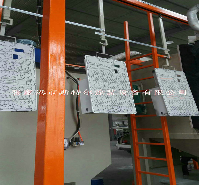 江蘇某企業在我司定制的懸掛鏈自動噴砂機具有以下幾個特點廠品:大部分是(shi)華為集團5G 基站(zhan)天線鋁殼板。