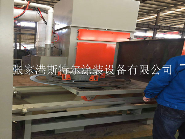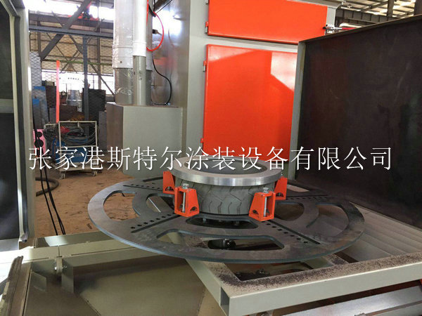 該設備由砂料回收系統、噴砂系統、除塵系統、工件旋轉及控制系統等組成。本設備的工件旋轉部分采用轉盤旋轉,輪轂在轉盤上旋轉的同時輪轂上方還布置8把擺動普壓噴槍,機倉內設有除塵及回砂系統,當工件通過噴砂后,可將工件清理干凈,從機倉出來前將用壓縮空氣將工件表面的粉塵吹凈,并吸到除塵箱里。我公司在設計輪胎模具噴砂機的相對經驗還是比較豐富,在噴砂機的設計理念上使用了新的技術和方案,保證在使用加工時候達到低能耗,低故障,高環保等要素,實現傻瓜式操作噴砂機加工模具。在工件進入工作倉的同時,可以實現手工操作和自動化操作,在噴砂機磨料撞擊工件產生的粉塵無任何泄露,保證操作工人的身心健康,噴砂機在使用中工作倉會產生粉塵等雜物我們通過旋風分離設備直接過濾和清除掉,防止二次污染等。整體噴砂設備機械配備了智能化控制系統,預警報警燈功能,在工件進入工作倉實現預警,在噴砂加工結束實現報警取件等措施,在使用中發揮設備的較大效率。